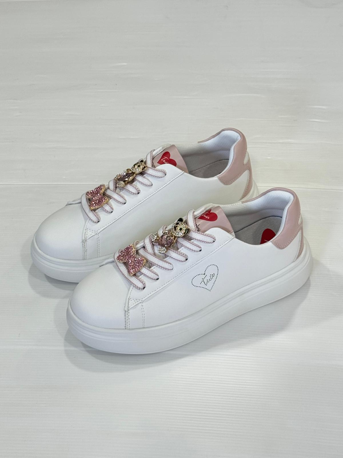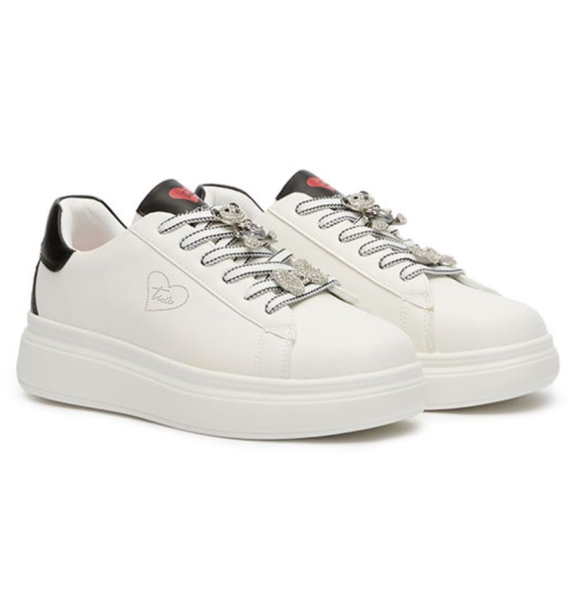 Comoda Sneakers con soletta in pelle , base in tinta unita bianca con dettagli di colore nero nella linguetta e nella parte superiore . lucenti accessori argenti removibili che ne decorano le stringhe, dettaglio logo tua laterale . suola platform in gomma bianca