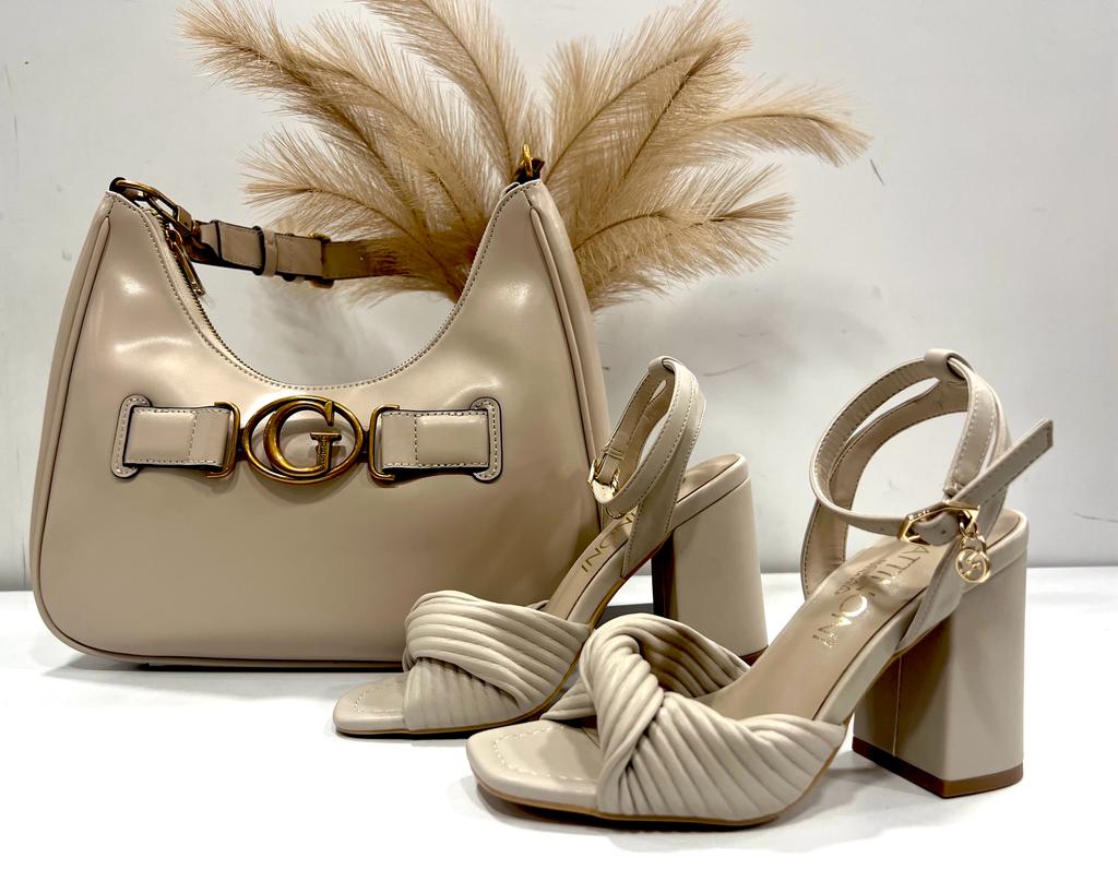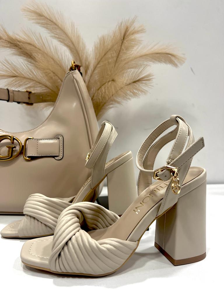 Gattinoni Sandali donna con tacco con tomaia in ecopelle, fascette intrecciate con nodo sul davanti, cinturino alla caviglia con fibbia regolabile con logo pendente, plantare morbido in vera pelle, suola zigrinata antiscivolo.