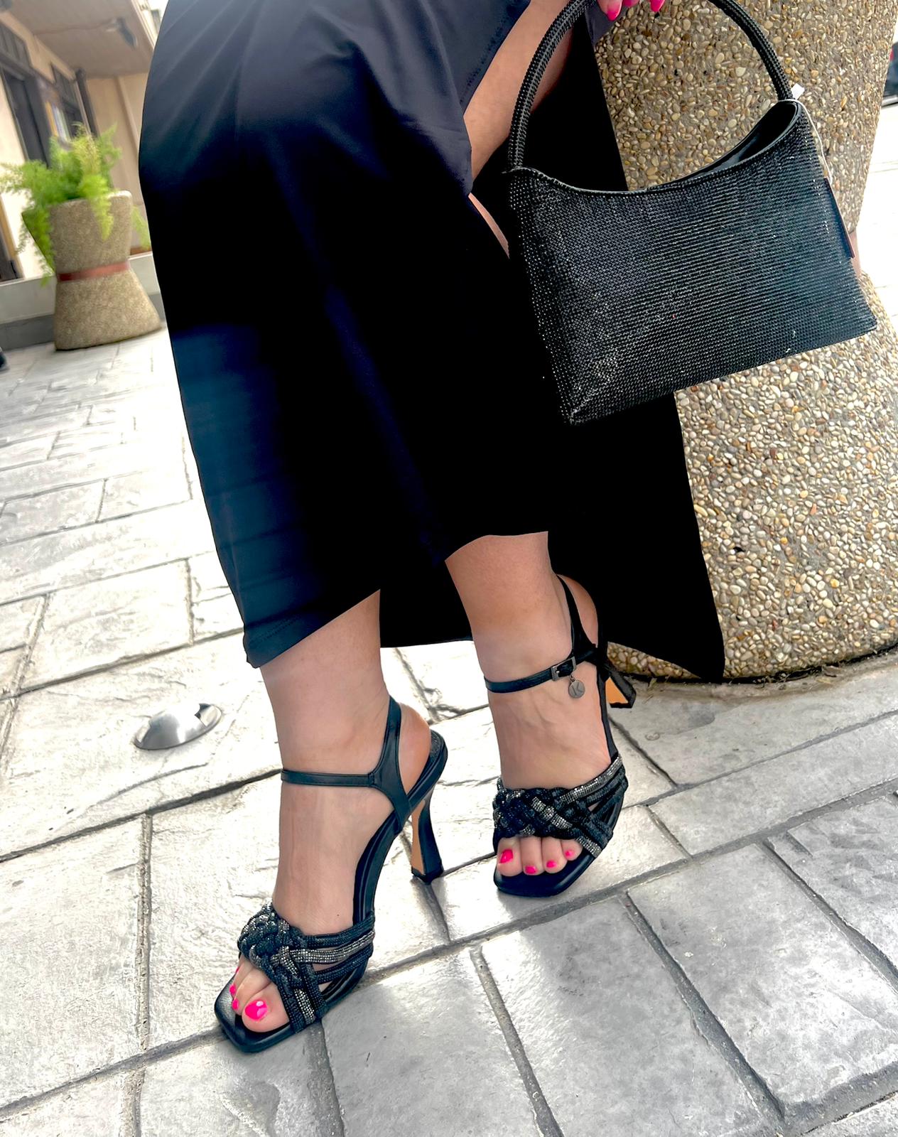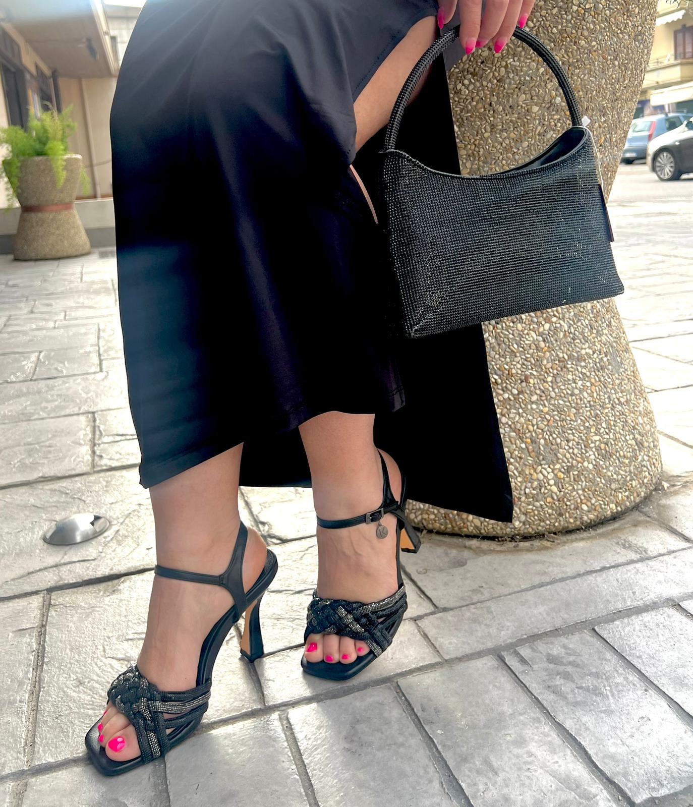 Il sandalo gioiello dal tacco di design particolare e a spigolo, dal cinturino unico in strass abbraccia il tuo piede per farti risplendere in tutte le occasioni!