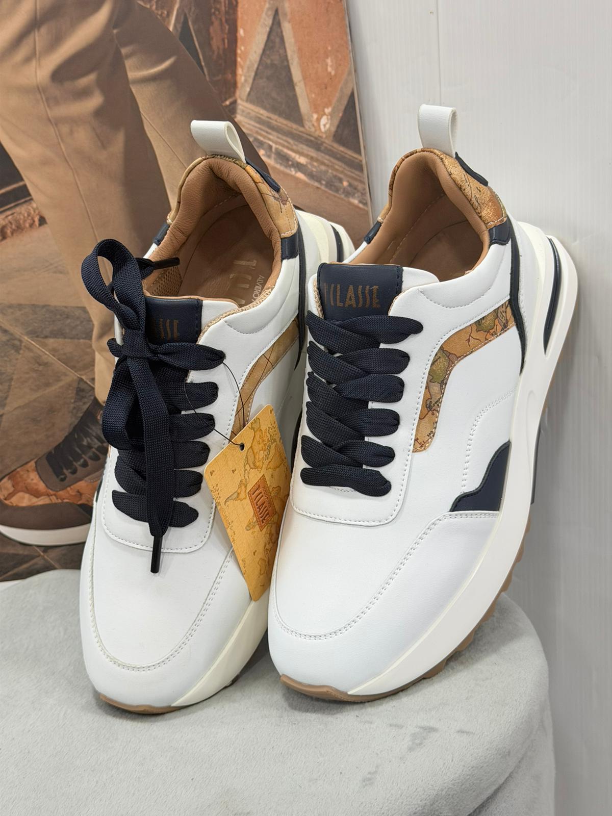 La palette bianca e blu delle sneaker in pelle Geo Road Glasgow è resa più vivace dall'inserto con stampa Geo Classic, mentre i loghi 1C e 1ᴬ Classe ne evidenziano lo stile iconico. Il design essenziale e l'attitude sportiva le rendono perfette da indossare sia in ufficio sia per una corsa serale.